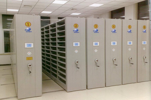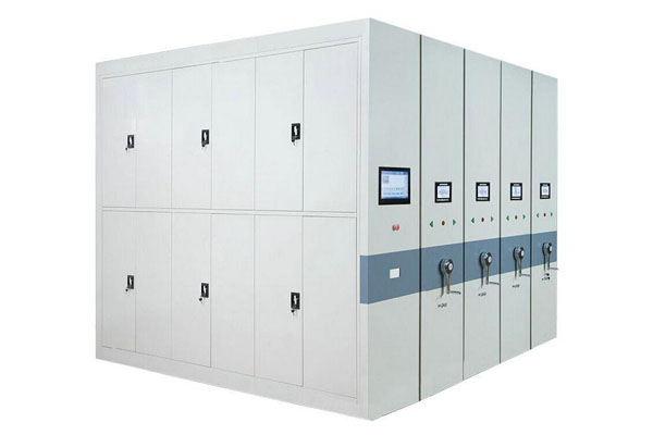 電動智能密集柜主要由軌道、底座、立柱(板式)、擱板、掛板、側靠板、背靠板、頂板、防塵板、護板、門板、傳動機構、防傾倒、防震、防塵、防鼠、制動、緩沖、目錄卡及傳動裝置、密封裝置組 成